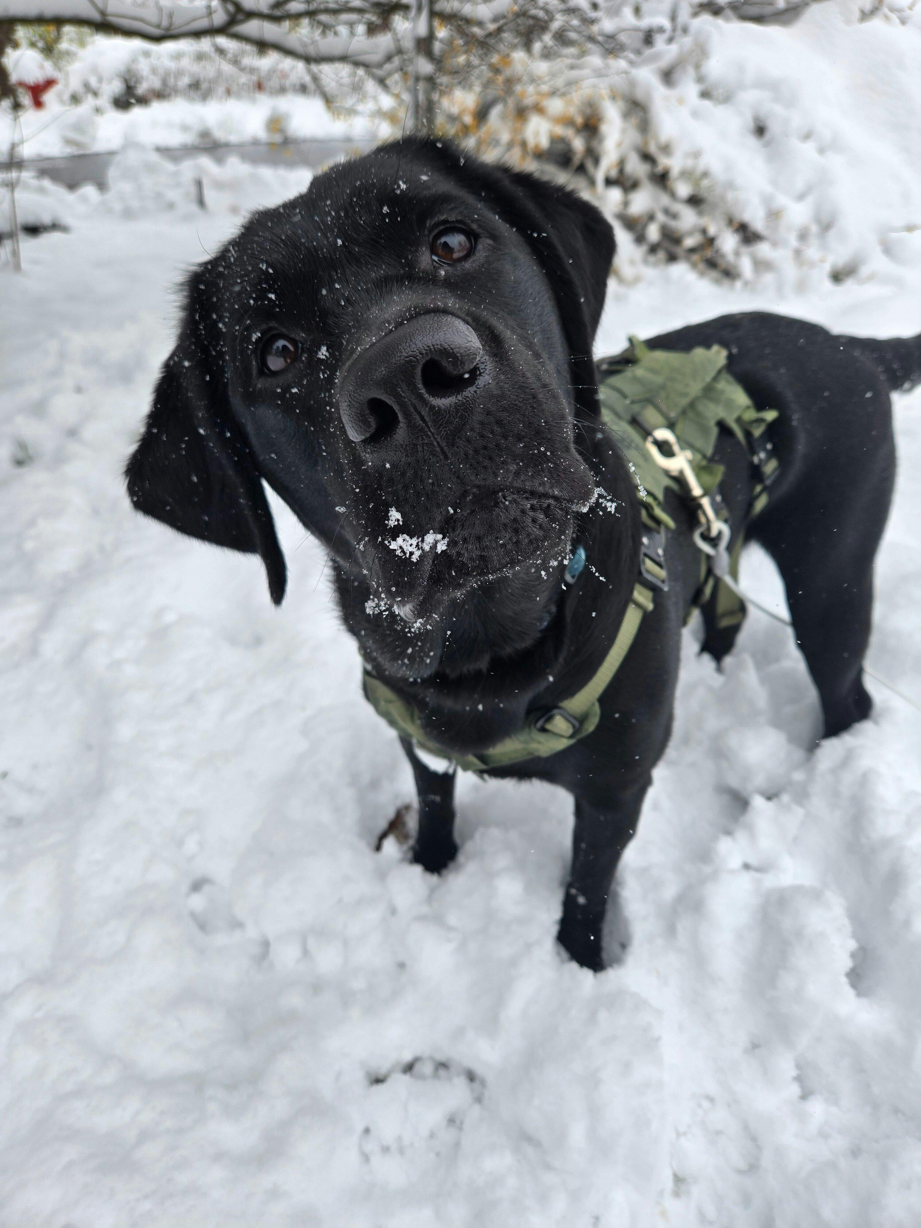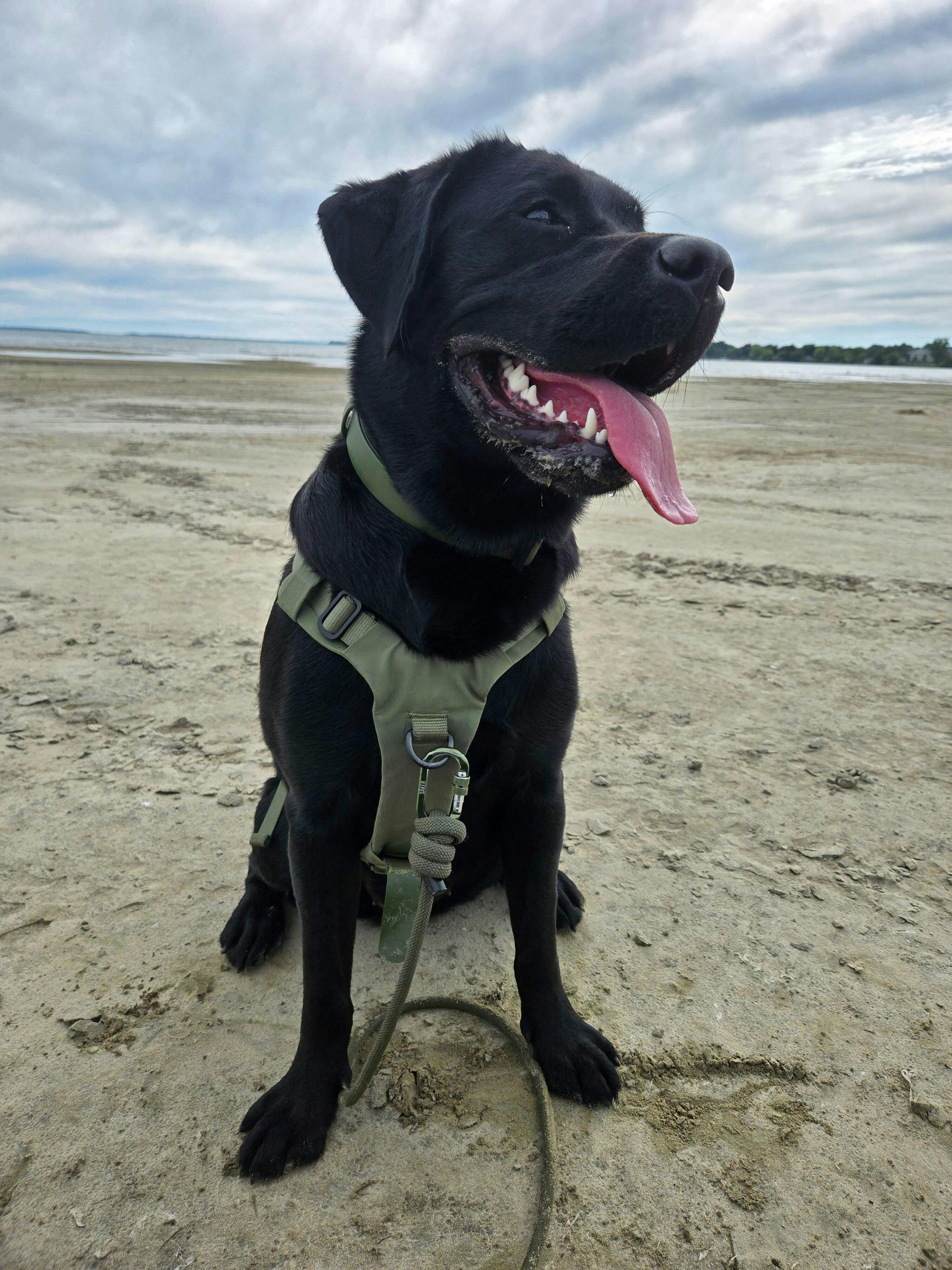 Dog tracting his owner with the Muse saker harness and the traction attachment. Dog tracting his owner with the Muse saker harness and the traction attachment.